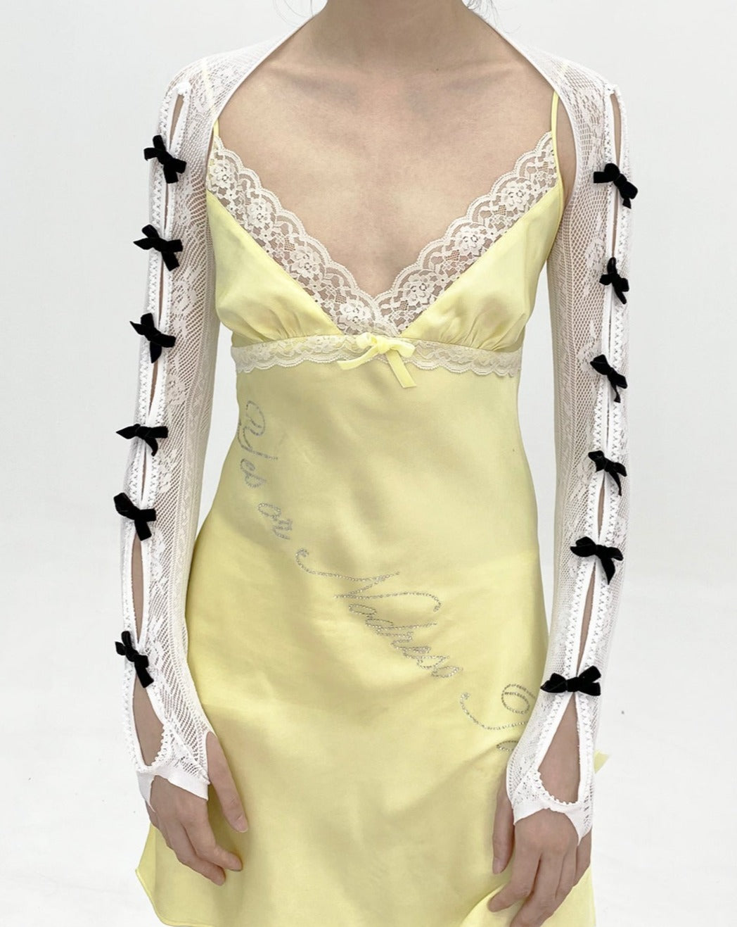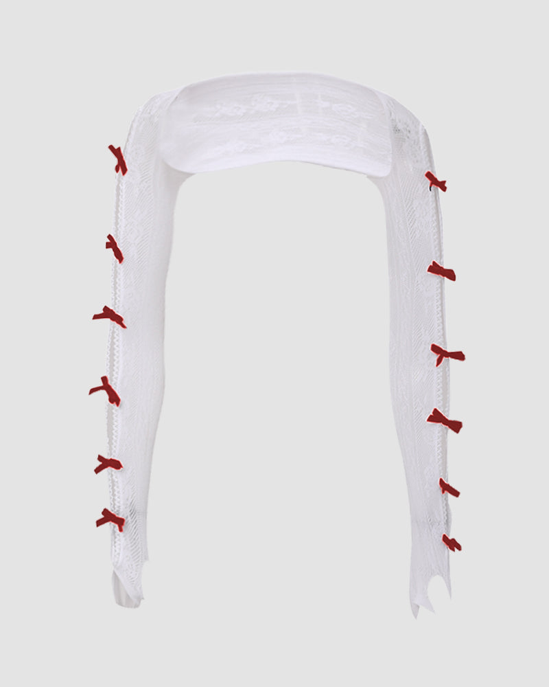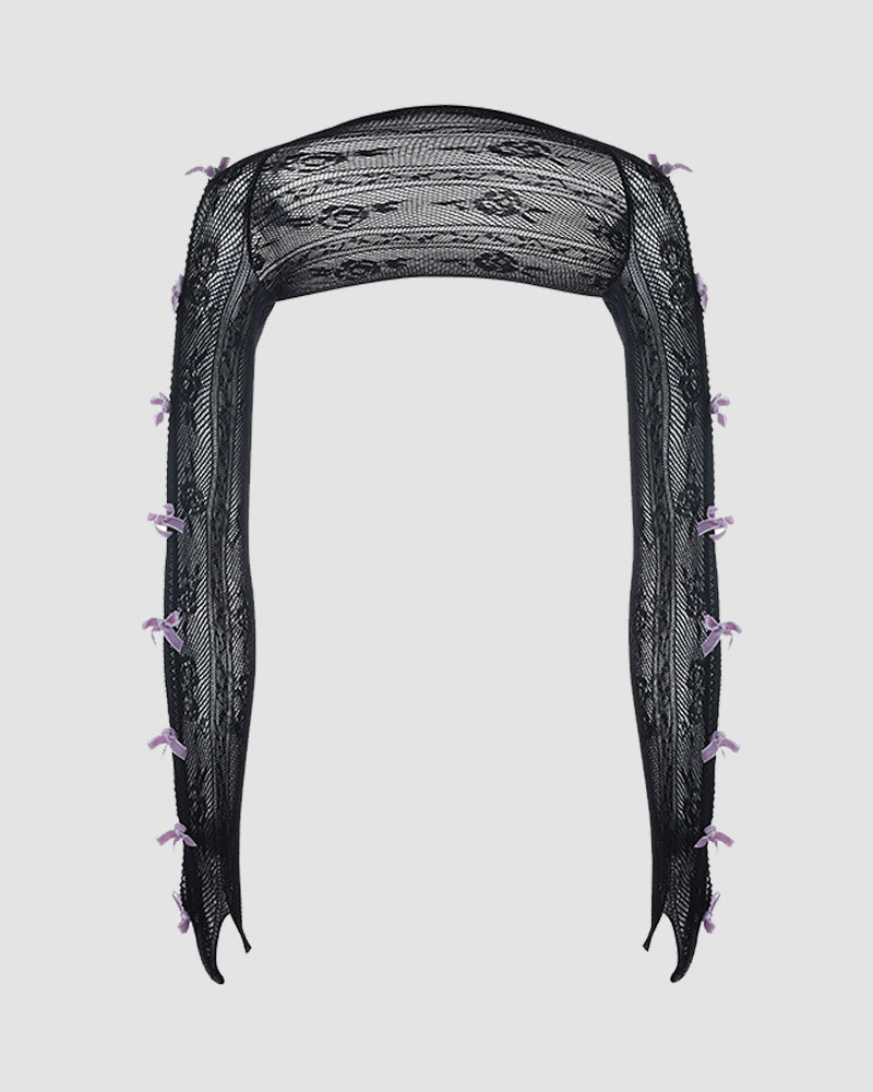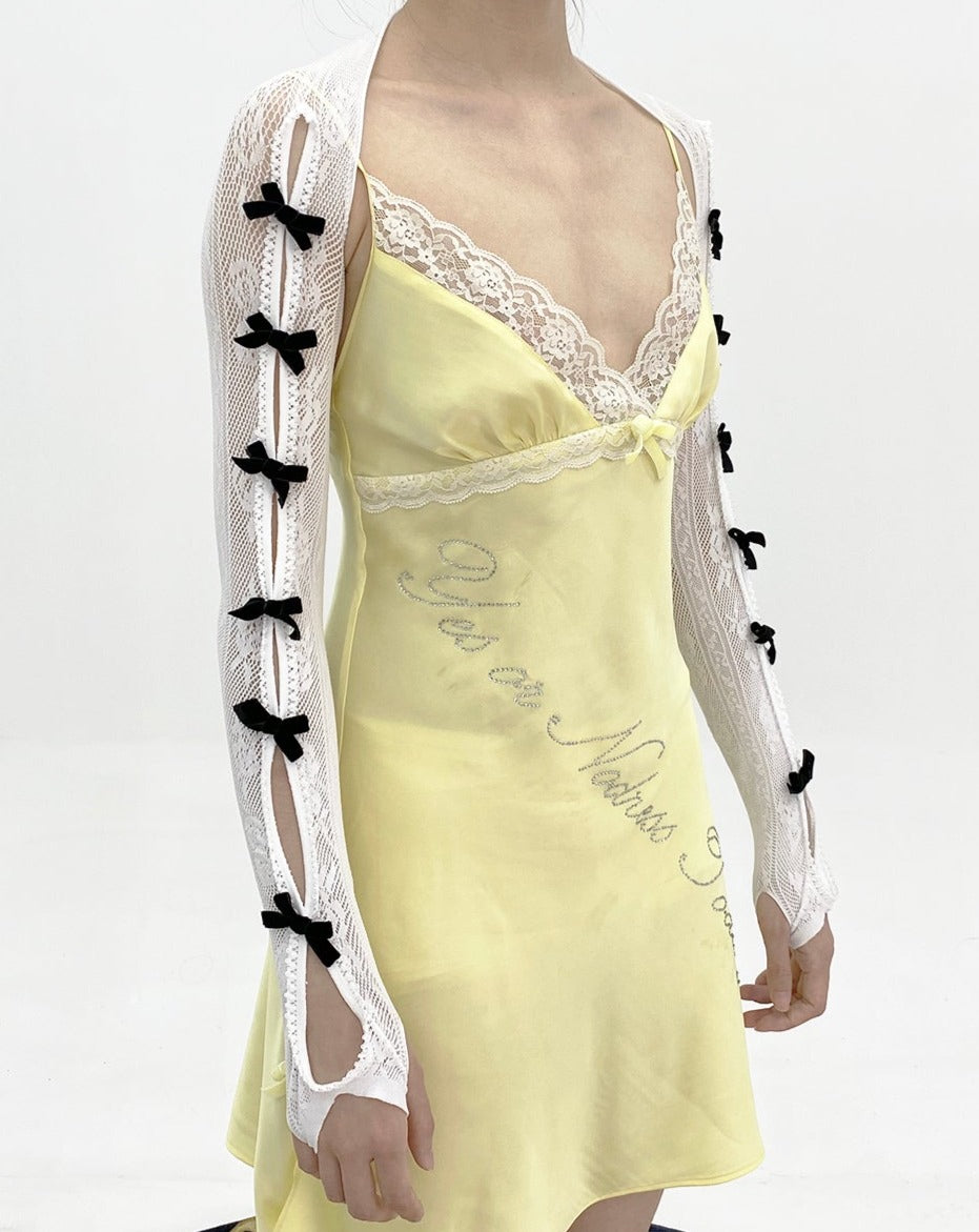 Details: A pair of gloves with ribbon design